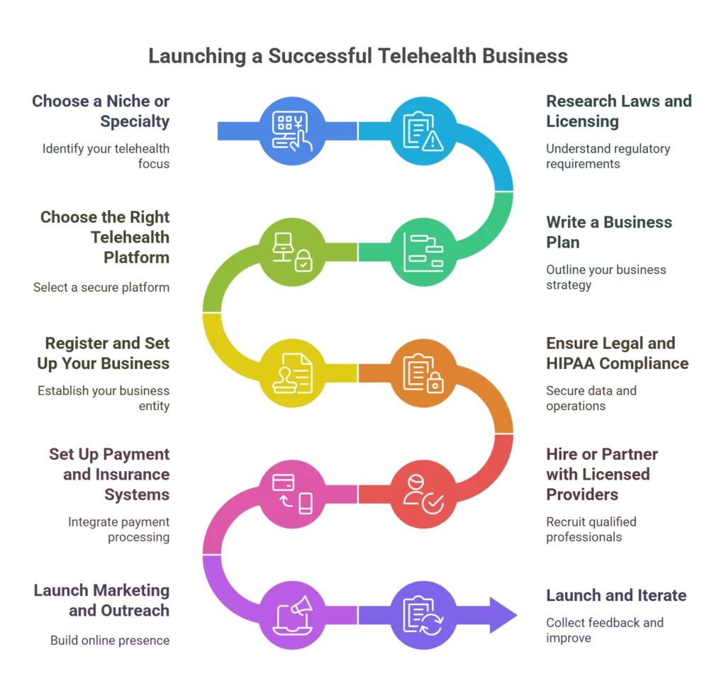 Here’s a practical breakdown of what you need to do to launch your telehealth business: