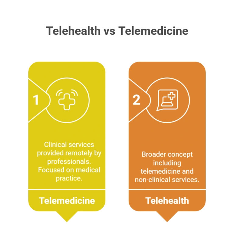 Telemedicine refers specifically to clinical services provided remotely by a licensed healthcare professional—such as diagnosing a patient over video or prescribing medications online. It’s narrowly focused on the practice of medicine.
